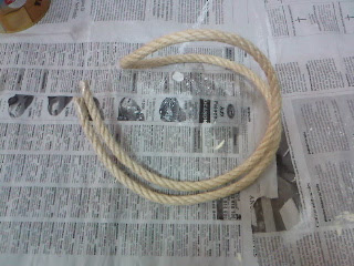 Y ahora es el momento de colocar las asas, escogí cuerda porque me gusta el efecto rústico que le da,le di en tinte gris,se hacen un par de nudos y se fijan con cola blanca para para que no se deshagan
