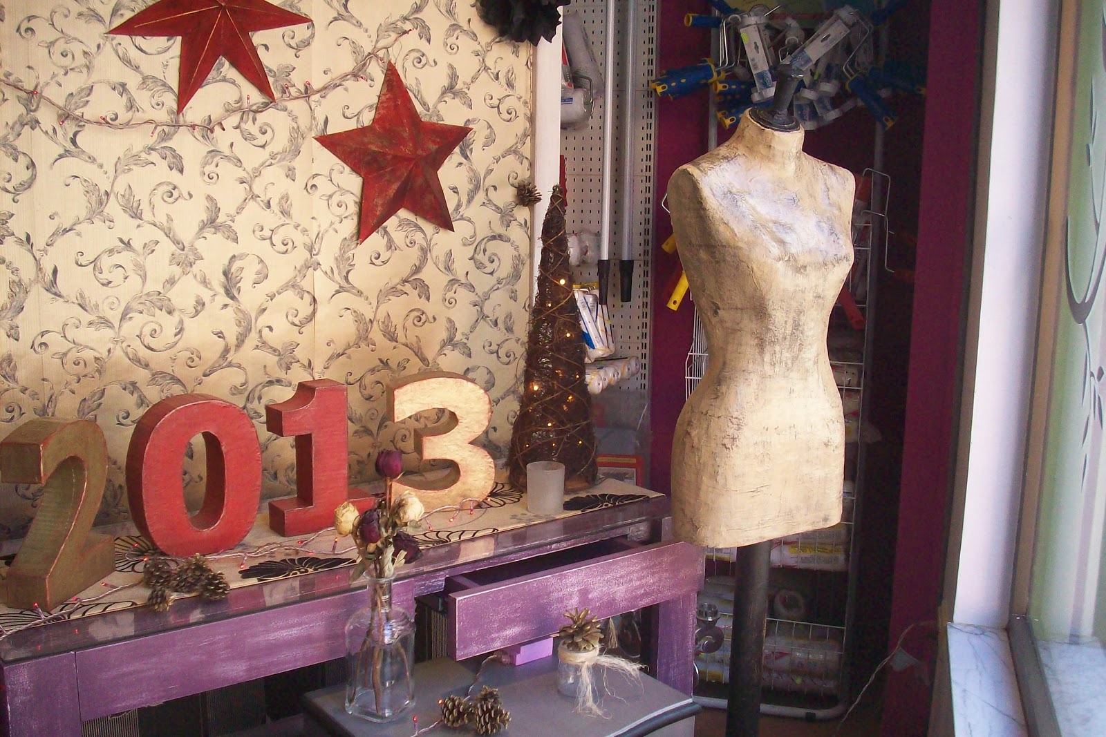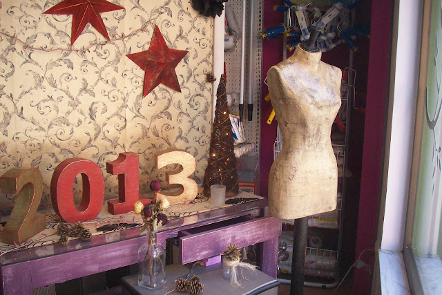 Como lo prometido es deuda hoy os enseño parte de mi escaparate,aunque todavía tiene algún detalle pendiente,pero ya va cogiendo algo de forma.Hemos preparado números de papel maché,en este caso como no podía ser de otra manera por supuesto con el año que está a punto de entrar,¡que esperemos sea para todos algo mejor que éste!,y también luce espléndido este maniquí de papel maché.
