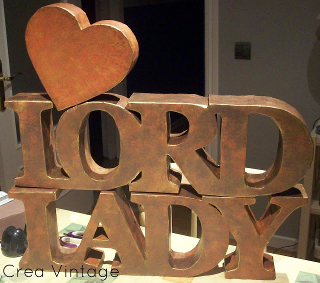 Últimamente en mi vida solo veo cartones,me he hecho adicta al reciclado de cartones,¡vamos que solo me falta pegarme por ellos en los contenedores!,hoy os voy a enseñar parte de lo que me ha tenido ocupada estos últimos días,que como no puede ser de otra forma está hecho de cartón ,son varios encargos que he tenido y que ya han cobrado forma,¿a ver que os parecen?...el primero es un tanto especial las palabras "LORD" y "LADY",separadas por un corazón,son para colocar sobre la cabecera de la cama y tienen un tamaño bastante grande,miden 20cm de alto y unos 60cm de largo cada palabra,la terminación imitando a oxido anaranjado el corazón y oxido marrón las letras...