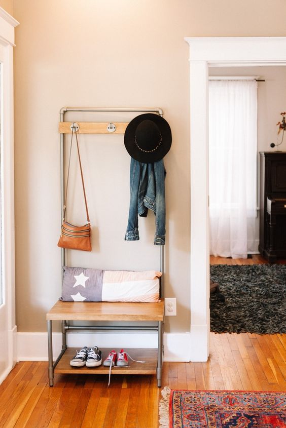 Para ampliar su funcionalidad deberíamos colocar algún perchero y algo de almacenaje. Para esta segunda función son ideales las cajas de fruta antiguas o algún taburete o cajón que tengas a mano.