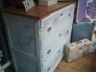....esta cómoda también la hicimos con la misma técnica pero usamos un color teja de base y gris de terminado, la verdad es que quedó estupenda, estoy esperando a que Lupe me mande las fotos con ella en su sitio, ¡seguro que le quedó espectacular!