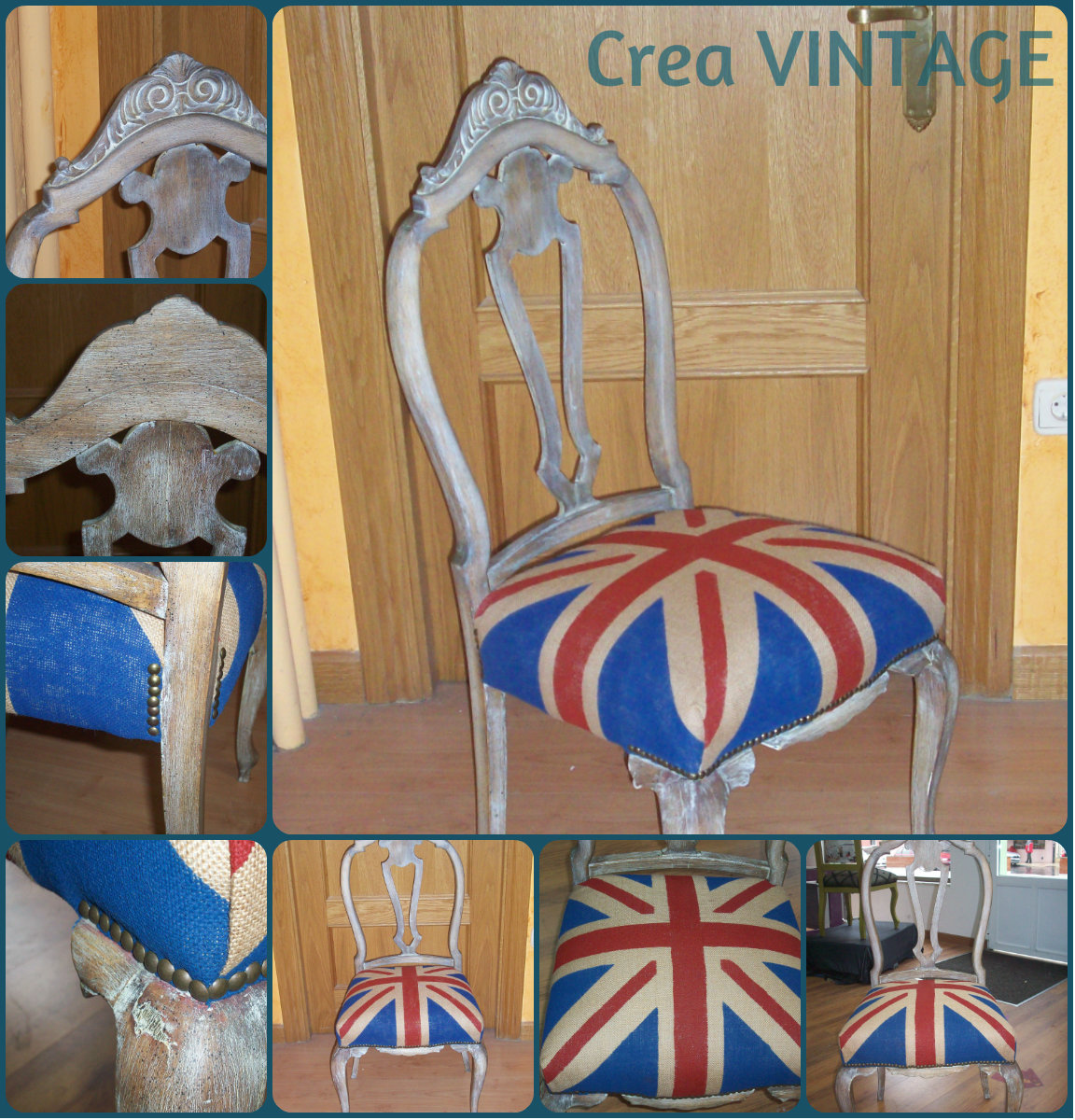 Este es uno de los últimos trabajos que me han encargado,tenía este par de sillas que estaban en el taller esperando dueño...y cómo siempre hay un roto para un descosido...¡apareció!...,el cliente tenía seis sillas para un salón bastante grande y le quedaban un poco pobres,necesitaba dos más para colocar en los extremos para llenar un poco el espacio y la sorpresa fue que en el taller había un par de sillas que encajaban a la perfección con las que él tenía.A Chema le encantaba la silla de la UNION JACK y la verdad es que junto con las el que ya tenía le podían dar un toque bastante VINTAGE